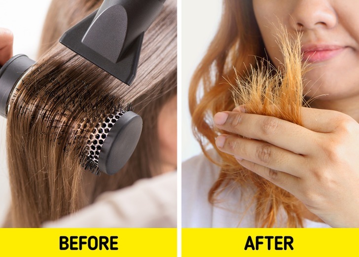 Thường xuyên sấy tóc, tạo kiểu bằng nhiệt độ cao cũng khiến nang tóc dễ tổn thương, ngày càng yếu, dễ gãy rụng, chẻ ngọn.